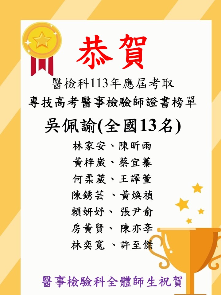 113年第二次醫事檢驗師專技高考榜單醫檢科吳佩諭同學於113年第二次醫事檢驗師專技高等考試考上全國第13名賀醫檢科學生考取113年第二次專技高考醫事檢驗師拔河第一名運動會-創意進場第四名醫檢科王政光老師和陳展泓老師帶領本科學生至日本高知大學學海築夢醫檢科葉旆妏同學參加112學年度全國學生音樂比賽苗栗縣初賽「高中職B組-中提琴獨奏」榮獲甲等仁德醫專56周年校慶 醫檢科創意進場榮獲第三名仁德醫專56周年校慶 醫檢科拔河比賽榮獲第一名醫事檢驗科 熱烈招生中!109國考橫幅-04賀 111 年七月專技考取名單歡迎加入仁德醫檢科大家族58週年校慶運動會~拔河比賽115.03.21一日醫檢師 想更加了解醫檢科學生日常及招生資訊可加醫檢科學會Instagram~▊最新公告 ▊賀 109年第二次醫檢師專技高考 詹尉辰全國第5名、邱榆軒全國第17名、李宥姍全國第20名賀 108年第二次醫檢師專技高考 王栩詒 全國榜首、陳亞軒全國第20名賀 107年第二次醫檢師專技高考謝佳勳榜首、李書安全國第6名、連家勝全國第14名醫檢科近五年醫檢師國考榜單最新公告一日醫檢師 海線活動2026 年 3 月 2 日仁德醫專醫檢科-天狗部落健康站2025 年 11 月 4 日一年一度的醫檢科迎新活動來嘍!2025 年 11 月 4 日仁德醫專創校58週年校慶暨運動大會2025 年 11 月 4 日2025.10.08 【仁德醫專醫檢科校友劉辰威回校分享國考經驗】2025 年 11 月 4 日more 累計瀏覽次數 : 5056